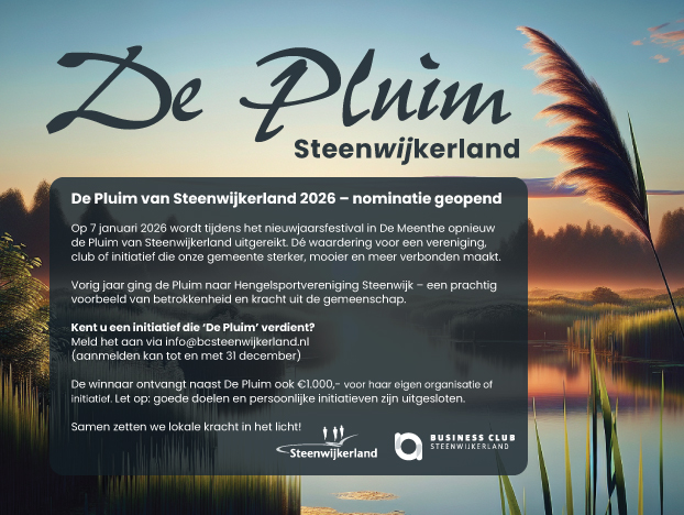 De gemeente Steenwijkerland nodigt u uit voor de Nieuwjaarsbijeenkomst en oproep voor De Pluim op woensdag 7 januari 2026 in De Meenthe. De Pluim is een waardering voor een vereniging, club of initiatief dat zich op een bijzondere manier inzet voor de samenleving. Een positieve opsteker én een aanmoediging voor organisaties die onze gemeenschap sterker, mooier en meer verbonden maken. Meldt uw vereniging, club of initiatief uit Oldemarkt hiervoor aan…!