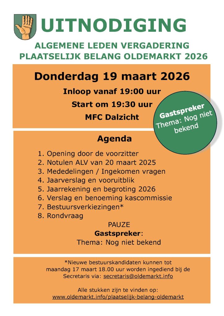 De werkgroep van Plaatselijk Belang Oldemarkt wordt hierover met regelmaat bijgepraat. In januari 2026 ligt het in de planning, dat de gemeente de bevolking van Oldemarkt een verdere toelichting gaat geven over de huidige stand van zaken. Verdere details volgen binnenkort. Hou deze website en Facebookpagina’s: https://www.facebook.com/PBOldemarkt/ en https://www.facebook.com/Leukedingeninoldemarkt/ in de gaten.