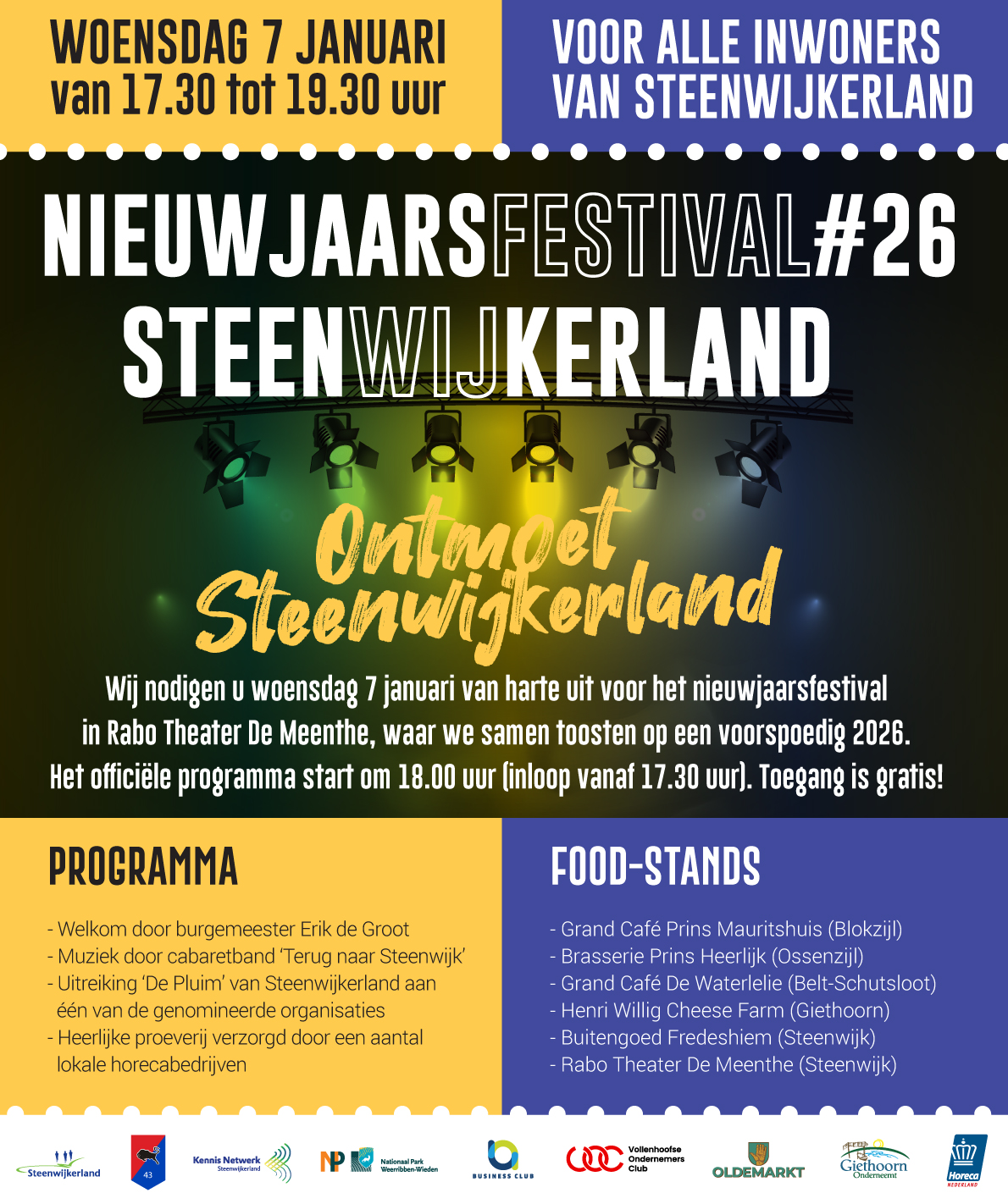 De gemeente Steenwijkerland nodigt u uit voor de Nieuwjaarsbijeenkomst en oproep voor De Pluim op woensdag 7 januari 2026 in De Meenthe. De Pluim is een waardering voor een vereniging, club of initiatief dat zich op een bijzondere manier inzet voor de samenleving. Een positieve opsteker én een aanmoediging voor organisaties die onze gemeenschap sterker, mooier en meer verbonden maken. Meldt uw vereniging, club of initiatief uit Oldemarkt hiervoor aan…!